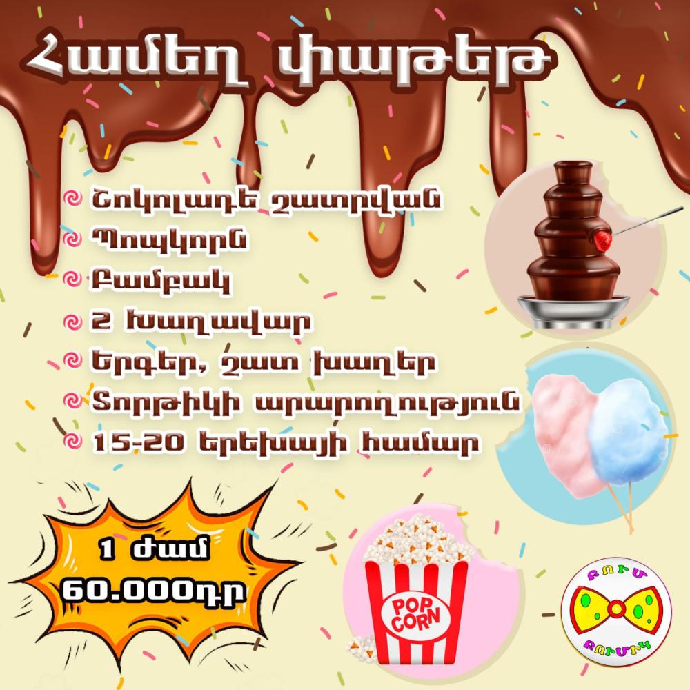 Շոկոլադե ֆոնդյու ծրագիրը ներառում է երկու խաղավար։ Շոուի ժամանակ լինում են երգեր, խաղեր, պարեր, մրցույթներ, ինչպես նաև խաղավարներն անցկացնում են տորթի արարողությունը։ Ծրագրի տևողությունը 1 ժամ է, արժեքը մինչև 15 հոգու համար 30,000դր է, 15-ից ավել ամեն մասնակցի դեպքում արժեքը կավելանա 1000 դրամով։ Տեխնիկան ներառված է։